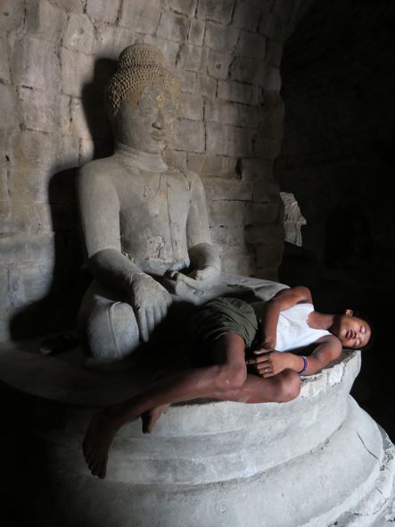 Tourists are the exception, not the rule here. In a good year, they get about 4,000 Western tourists, and the overwhelming majority come during the high season, November to February. In the four days I was there, I saw a total of four Westerners, and I was essentially alone at every temple site, save for a few Burmese and an occasional sleeper. Check out this guy I saw one deliriously hot afternoon – he was looking for a place to escape.